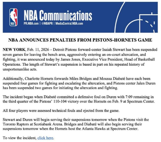 活塞球员斯图尔特和杜伦的禁赛,将从2月12日开始执行,他们将无缘活塞客场对阵猛龙的比赛,之后也将继续禁赛。至于布里奇斯和迪亚巴特的禁赛,也将从2月12日开始执行,届时黄蜂主场迎战老鹰。