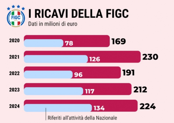 预算方面,回顾过去十年财务数据,即便两次无缘世界杯正赛,足协依旧实现盈利,只是营收会出现下滑(2018年营收8100万欧元,2017年为8800万欧元;2022年营收9600万欧元,2021年则有1.26亿欧元)。即便今年落到最差结局,大概率也会延续这一盈利态势。但这份预算,能清晰算出世界杯对意大利足协的实际价值。足协管理层解释,与赞助商签订的合作协议中设有扣款条款:一旦无缘世界杯,赞助费用将自动下调,总计会减少950万欧元收入。需要说明的是,足协商业板块正处于高速增长阶段。以赞助合同常规的四年周期核算,国家队相关赞助与广告营收,从2015-2018周期年均4200万欧元,增至2019-2022周期年均4900万欧元。而2023开启、今年结束的四年周期营收大幅飙升,年均超7000万欧元,2024年更是创下8100万欧元的峰值。