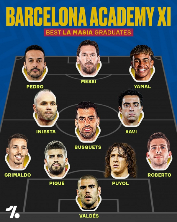 Onefootball列出了由拉玛西亚青训球员组成的阵容,梅西、哈维、伊涅斯塔、亚马尔在列。